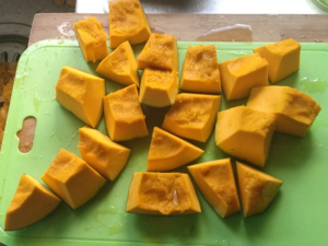 ![]() ⑧南瓜は種とワタを取り、一口大に切ります。 |