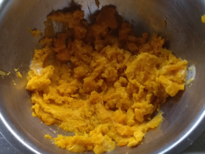 ![]() ⑩南瓜の黄色い部分だけをスプーンですくい取り、熱いうちにバターも加え、マッシャーでつぶします。 |