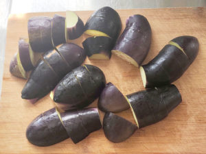 ![]() 1:ナスはヘタを取り、縦に半分に切ってから、食べやすい大きさの半月切りにします。 |
