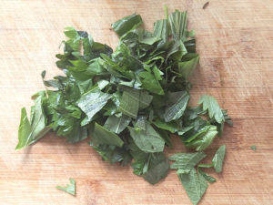 ![]() 2:青じそは軸を取り、粗みじん切りにしましょう。 |