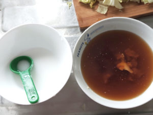 ![]() 6:混ぜて置いたしょうゆ液の方をフライパンに加え、白菜の葉の部分も加えて、良く混ぜあわせます。 |