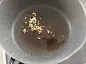 ![]() 3:フライパンにごま油を引き、弱火でにんにくと生姜を炒めて香りを出します。 |