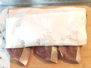 ![]() 1:ブリの切り身は、両面をキッチンタオルなどで水気を拭き取っておきます。 |