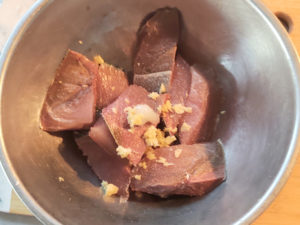 ![]() 3:少し大きめのボールに、切ったブリ、にんにく、生姜、塩を加え、全体に味を絡ませます。 4:冷蔵庫に入れて、10~15分置きましょう。 |