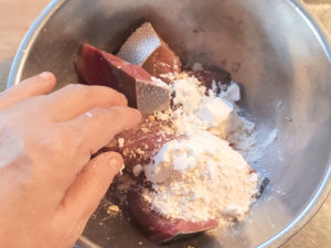 ![]() 6:ブリの切り身に、軽く混ぜた片栗粉と薄力粉を加え、手でまんべんなく粉をまぶしましょう。 |