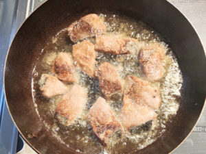 ![]() 7:180度の油で、表面にやや色が付くまでしっかり目に揚げます。 |