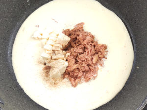![]() 3:フライパンに、生クリーム、シーチキン、クリームチーズ、塩、こしょうを加えて火にかけます。 |