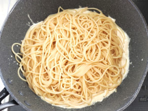 ![]() 6:ゆでたパスタもフライパンに加え、ソースを全体に絡めます。 |