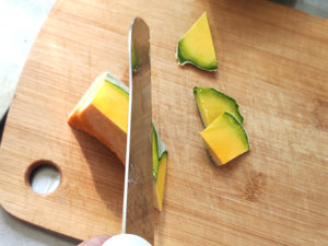 ![]() 1:南瓜は種とワタを取り除き、計量を済ませてから、皮を包丁で切り取り、さらに、5mm角ほどの角切りにします。 |