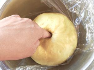 ![]() 12:生地が1.5倍くらいに膨らんだら、ガス抜きをします。 |