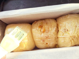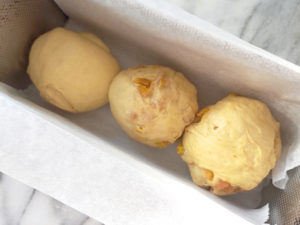 ![]() 15:パウンドケーキ型にオーブンシートを敷き、生地を型に一列に並べます。 16:30度のオーブンで60分温め、二次発酵させましょう。 (このとき、塗る用のマーガリンも温めて溶かしておいてください。) |