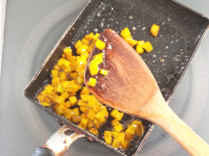 ![]() 4:シロップが冷めないうちに、南瓜の角切りを加え、全体にシロップが絡んだら、しっかりと冷ましておきましょう。 |