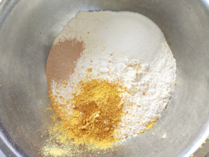 ![]() 6:ボールに強力粉、砂糖、ドライイースト、かぼちゃパウダーを入れて軽く混ぜます。 |