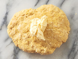 ![]() 8:室温に戻したマーガリンを挟むようにして包み、台に移して、表面が滑らかになるまで10分ほど捏ねます。 |