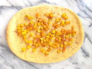 ![]() 9:生地を楕円形に伸ばし、シナモンを振りかけてから、南瓜の角切りを乗せ、上から軽く押さえましょう。 |