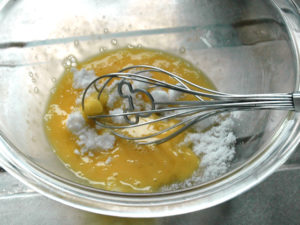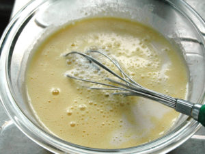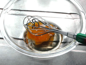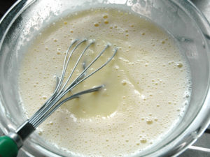 ![]() 1:まず、カスタードクリームから作ります。 2:耐熱ボールに全卵を割りほぐしましょう。 |