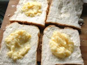 ![]() 10:パンを4枚用意し、中央を四角く、軽く指で窪ませたら、バターを少々塗り、窪みの中にクリームをたっぷり入れましょう。 11:パンを二枚重ねて、2人分のパンを作ります。 |