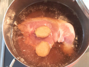 ![]() 3:鍋に肉と生姜の薄切りも加えて、中火で5分ほど煮ます。 4:片面の色が変わったら、ひっくり返しましょう。 |