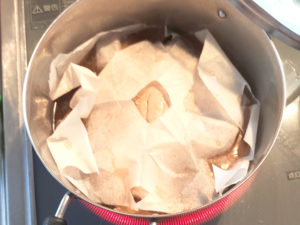 落し蓋は、今回クッキングシートを使いましたが、シートは燃える心配があるので、鍋より小さめに作るようにしてください。