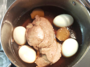 ![]() 6:20分経ったら、殻をむいたゆで卵も鍋に加え、再び落し蓋をして、中火で20分煮ればOK。 |