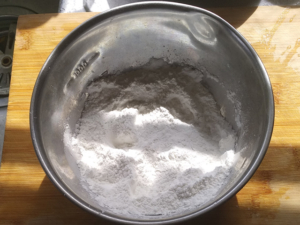 ③南瓜をゆでている間に、ボールに白玉粉、上新粉、砂糖を入れて、良く混ぜ合わせておきましょう。
