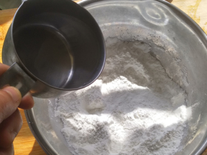 ④水を少しずつ加えながら練り、耳たぶくらいの柔らかさになったら、ひとまとめにします。