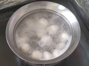 ⑦小鍋にお湯を沸かし、団子をゆで、浮いてきたら、更に2~3分ゆでます。