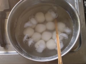 ⑧氷水を入れたボールに、ゆでた団子を入れ、しっかりと冷やします。