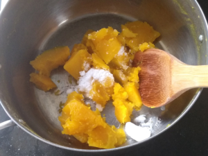 ⑨南瓜はゆだったら、皮の黄色い部分だけをスプーンですくい取り、砂糖を混ぜて、木べらで良く練ります。