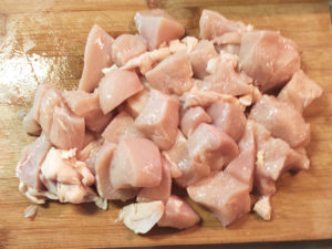 ![]() 1:鶏むね肉は、ちょっと大きめの一口大に切ります。 |