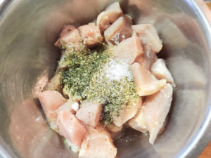 ![]() 2:ボールに鶏肉と塩、ウェイパー、青のりを入れ、手でよくもみこみましょう。 |
