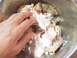 ![]() 3:片栗粉も加え、全体に粉をまぶします。 |
