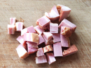 ![]() 1:ベーコンブロックは、角切りにします。 |