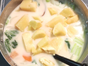 ![]() 10:火を止め、クリームシチューのルーを溶かしましょう。 (火が入ったままだと、ルーがキレイに溶けてくれません。) |