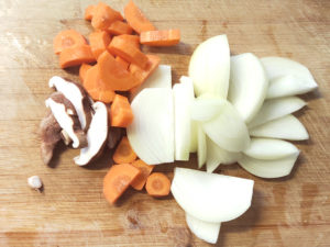 ![]() 2:玉ねぎは皮をむいて薄切りに、人参は皮をむいて半月切りに、椎茸は軸を取り薄切りにしましょう。 |