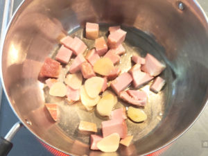 ![]() 3:鍋に薄く油(分量外)と薄切りにんにく、ベーコンを入れて弱火で炒めて香りを出します。 |