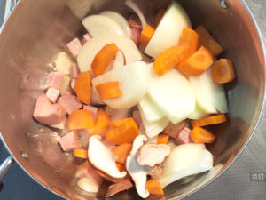![]() 4:玉ねぎと人参、椎茸も投入し、全体に油が回るまで、1分ほど火を通しましょう。 |