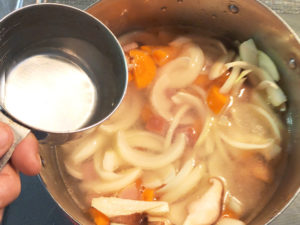 ![]() 5:水を加えたら、蓋をして一旦沸騰させ、沸騰したら、10分ほど煮込みます。 |