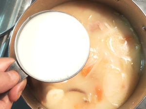![]() 8:鍋に冷たい牛乳も加えて、全体を一度混ぜましょう。 |