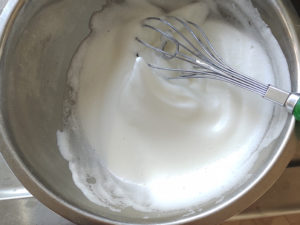![]() 1:卵黄と卵白を別々のボールに入れます。 2:卵白に砂糖を一つまみ加えて泡立て始め、途中二回に分けて砂糖を加え、ピンと角が立つまで泡だててメレンゲを作りましょう。 |