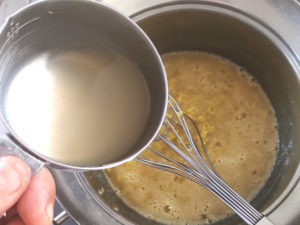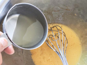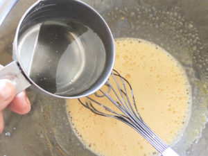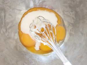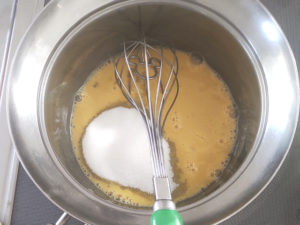 ![]() 3:卵黄のボールに砂糖を加えて泡立て、白っぽくとろりとするまで泡だてましょう。 |