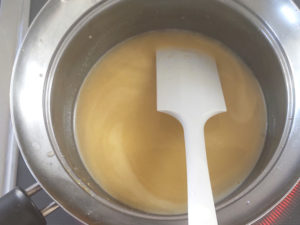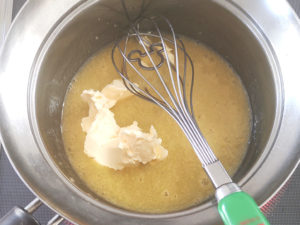 ![]() 14:有塩マーガリンも加え、弱火にかけてマーガリンを溶かしましょう。 |
