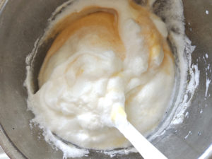![]() 7:卵黄のボールにメレンゲを全量加え、ゴムべらに持ち替えて、さっくりと練らないように混ぜましょう。 |