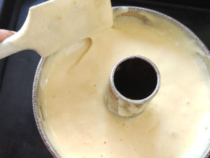 ![]() 8:生地を型に流し入れ、縁部分と筒部分に生地をなすりつけるようにして、焼きあがりを助けます。 |