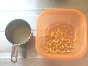 ![]() 10:レモンは、皮の黄色い部分だけをすりおろしましょう。 11:この時、果汁も一緒に絞っておきます。 (果汁が足りない場合は、ポッカレモンを足してもOKです。) |