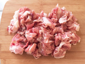 ![]() 2:豚こまは食べやすい長さに切りましょう。 |