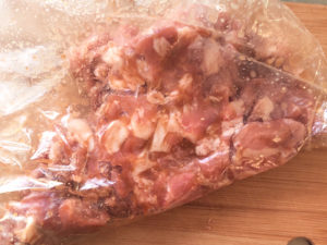 ![]() 3:ZIPロックの中に、豚肉を入れて再度外側からもみこみ、冷蔵庫で30分ほど寝かせます。 |