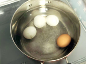 ![]() 4:卵は尖ってない方に画びょうなどで穴を開け、水からゆでてゆで卵を作りましょう。 (沸騰してから、10分ほどでできます。) |