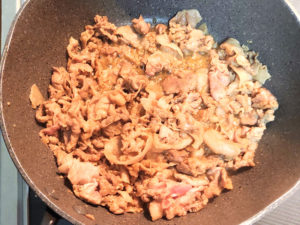 ![]() 5:フライパンに油をひかずに、豚こまを炒め、豚こまに完全に火が通ればOK。 |