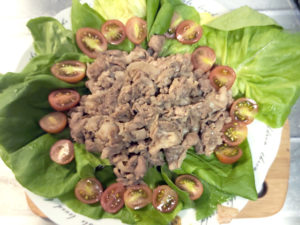 ![]() 6:器に、サラダ菜、豚肉、半分に切ったミニトマト、殻をむいて半分に切ったゆで卵、かいわれ菜を飾ります。 |